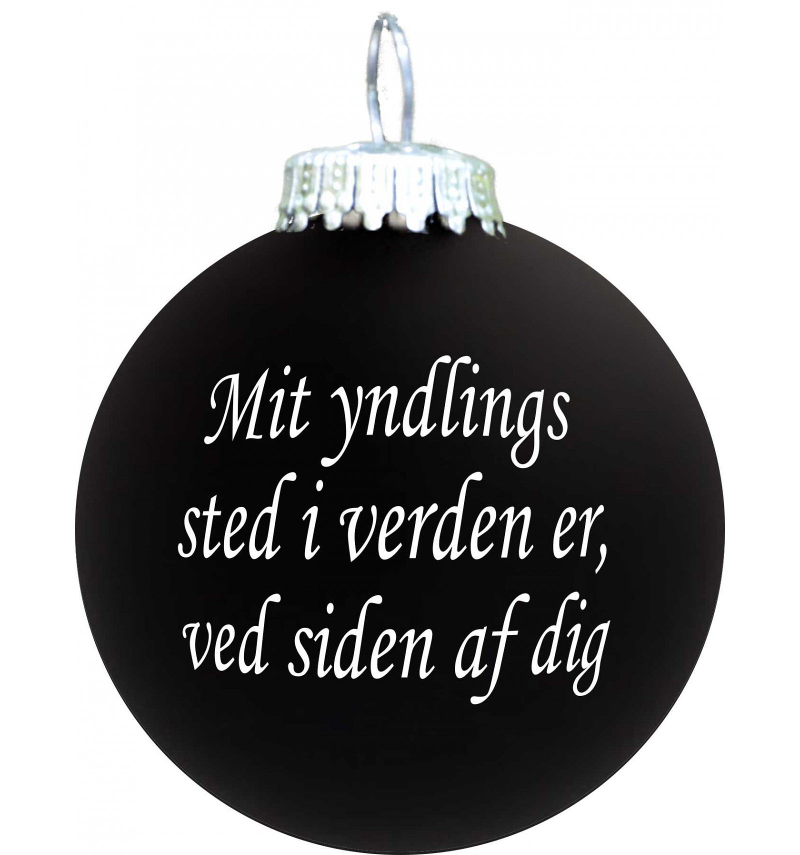 Sort julekugle med hvid tekst.